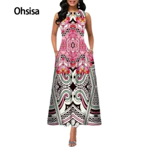 Ohsisa Summer Holiday Women’s Full Printed Pleated Stretchy Sleeveless Curve Midi Casual Dresses