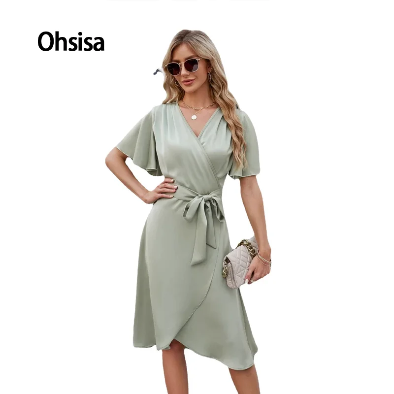 Ohsisa 2025 Summer for Woman Dress Satin V Neck Waist Bell Sleeves Plaid Dress European American Casual Style New Woman Dress